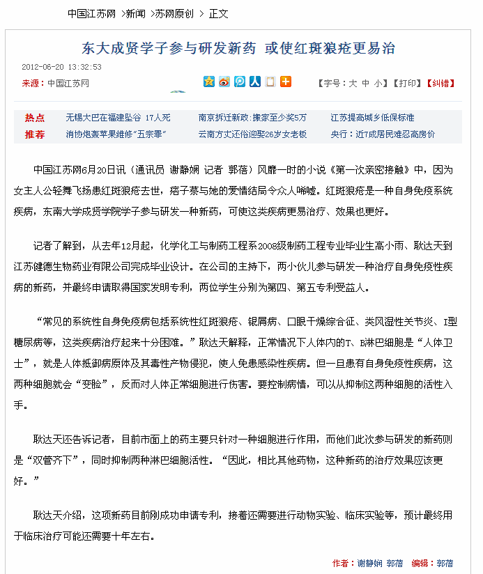 【中国江苏网】东大成贤学子参与研发新药 或使红斑狼疮更易治