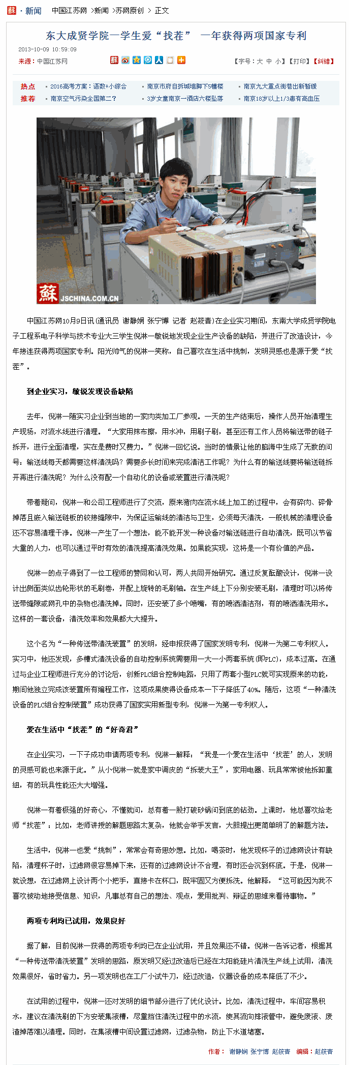 【中国江苏网】东大成贤学院一学生爱“找茬” 一年获得两项国家专利