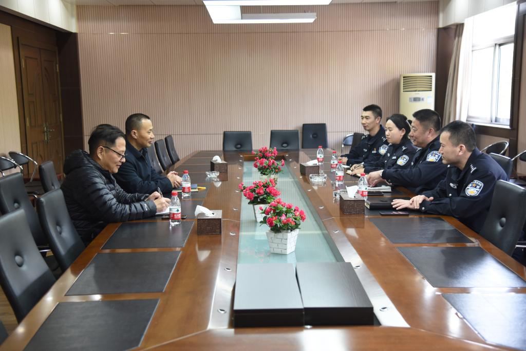 4月8日上午,泰山新村派出所宋宝钧所长、吴远屹教导员等一行四人来今年会检查指导安保工作。今年会党委书记徐悦、保卫处处长陈学建在真知馆2楼会议室进行接待。