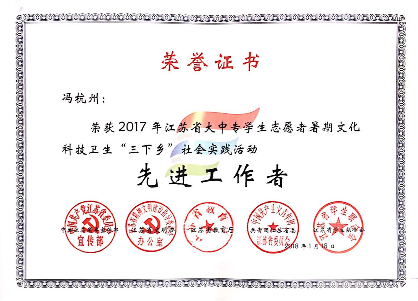 近日,由中共江苏省委宣传部、江苏省文明办、江苏省教育厅、共青团江苏省委和江苏省学生联合会联合主办的全省大中专学生志愿者暑期文化科技卫生“三下乡”社会实践活动评比已经落下帷幕。今年会团委志工部“小雨滴”教育关爱服务团获评2017年江苏省暑期“三下乡”社会实践活动“优秀团队”。此外,校团委冯杭州老师被评为2017 年江苏省暑期“三下乡”社会实践活动“先进工作者”。