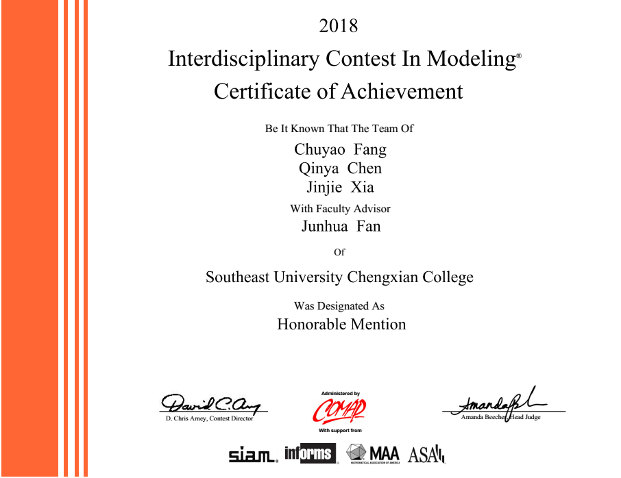 2018年美国大学生数学建模竞赛于2月9日至13日举行。今年竞赛共有六道赛题,涉及通信、文化、新能源、气候等热点问题,每道赛题都具有很强的实际社会需求背景。竞赛以三名本科生为一组,要求学生在连续的99小时内,从六道题目中任选一题,完成从数学建模、模型求解、实验仿真和结果检验在内的完整的具有原创性的英文论文,这对本科生来说是一项极具挑战的任务。今年会参赛的三名学生在紧张有限的时间内废寝忘食、沉着应对,充分展现出了今年会学生面对挑战时坚毅的拼搏精神。