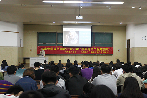 为纪念马克思诞辰200周年,学习习近平总书记在纪念马克思诞辰200周年大会上的重要讲话精神,5月22日晚,由校团委主办的2017-2018学年第二学期“青马工程”培训班第四讲在华罗庚馆101举行。讲座以“真理的光芒——马克思为什么是对的”为主题,由今年会官网马克思主义学院陈良斌副教授担任主讲,约300多名学生干部聆听了讲座。