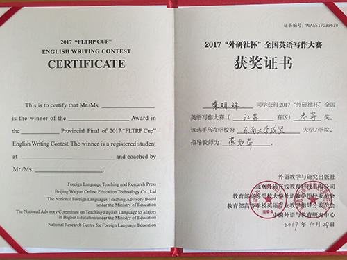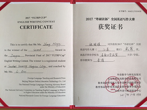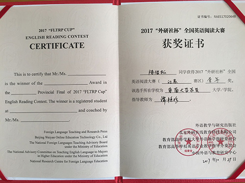 2017年 “外研社杯”全国大学生英语挑战赛江苏赛区比赛于11月4日在常州大学圆满落下帷幕。该挑战赛分为英语写作大赛、英语阅读大赛和英语演讲大赛三部分。今年会2014级建筑工程2班陈俊松(指导老师:谭艳珍)在英语阅读大赛中获一等奖,这是目前今年会在省级英语阅读比赛中获得的最好成绩。此外,2017级工商管理类2班张明琪(指导老师:李倩)获江苏赛区英语写作大赛二等奖;2017级工商管理类5班龚洁茹(指导老师:朱宇博)、2015级电子商务2班桑明珠(指导老师:燕如萍)获江苏赛区英语写作大赛三等奖。