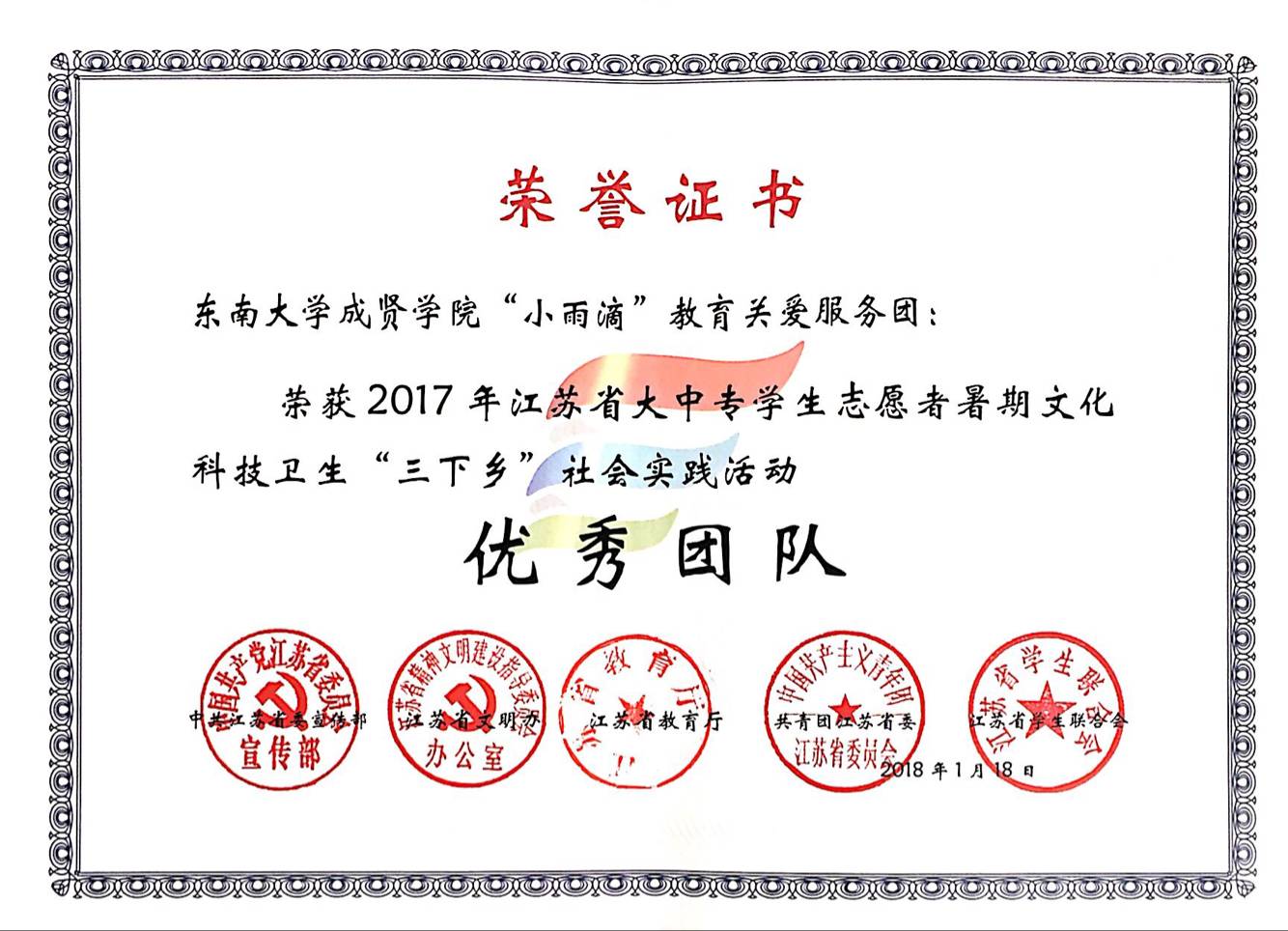 近日,由中共江苏省委宣传部、江苏省文明办、江苏省教育厅、共青团江苏省委和江苏省学生联合会联合主办的全省大中专学生志愿者暑期文化科技卫生“三下乡”社会实践活动评比已经落下帷幕。今年会团委志工部“小雨滴”教育关爱服务团获评2017年江苏省暑期“三下乡”社会实践活动“优秀团队”。此外,校团委冯杭州老师被评为2017 年江苏省暑期“三下乡”社会实践活动“先进工作者”。