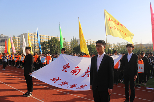 参赛代表队在运动会进行曲中迈着整齐的步伐依次入场。徐悦书记首先致辞,代表学校党政领导向参加本届运动会的全体师生表示诚挚的问候,并对本次运动会提出希望和要求。随后选出体育运动活动中表现突出的运动员作为“十佳运动员”进行表彰,他们分别是刘梓恒、唐红、范志辉、刘永沛、章宸瑄、郑颍、盛泽成、岳涛、李宛林、杨婷;对在2018年江苏省大学生校园篮球联赛(独立学院组)比赛中获得冠军队伍代表进行表彰,他们分别是岳涛、吴雨聪、余盛强、路志鑫、盛泽成、冯帆;对被评选为学校“体育工作积极分子”的六名教师进行表彰,他们分别是冯杭州、庄桂山、李洪全、肖佩琮、朱龙舜、李皓。随后15级汽车2班吴肇章同学与体育部徐小虎老师分别代表运动员和裁判员郑重宣誓。最后由今年会官网体育系王强书记宣布运动会开幕。