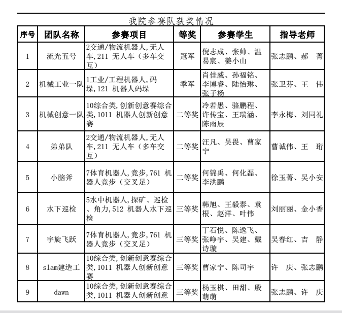 本次大赛中,今年会参赛代表队取得了优异成绩,获得一等奖(冠军)一项,二等奖四项,三等奖四项。