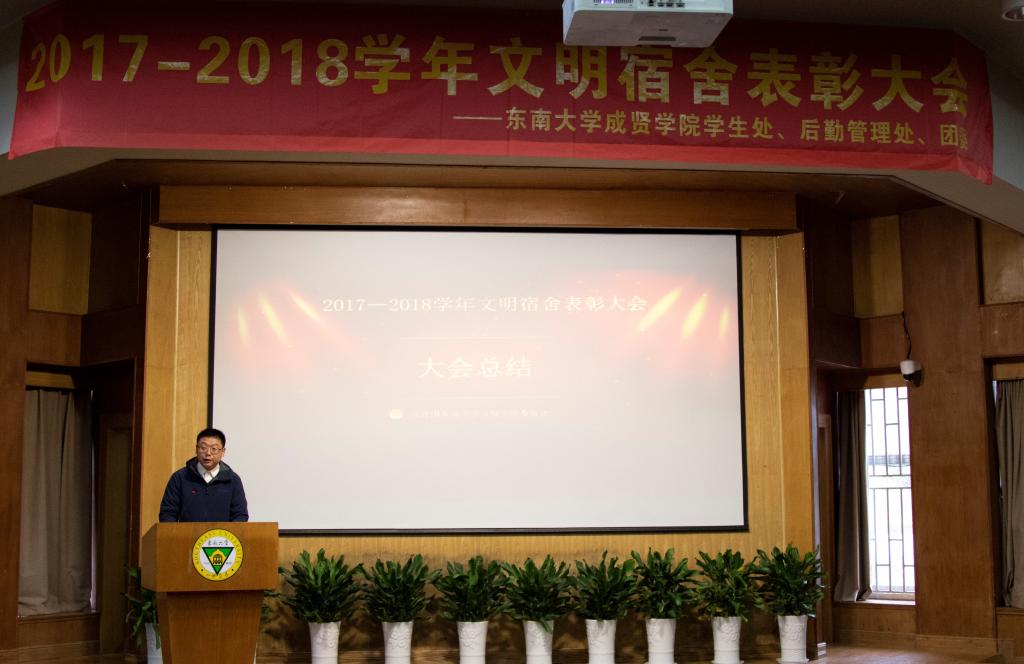 大会伊始,后勤管理处副处长丁秀山宣读了《关于2017-2018学年文明宿舍表彰的决定》;随后,团委书记潘明烽、后勤管理处副处长丁秀山、学生处处长助理颜秉明和后勤管理处赵萍萍四位老师分别为获得文明宿舍特、一、二、三等奖的宿舍颁奖。其中,桃11-404-2宿舍摘得特等奖;一等奖宿舍2个(桃12-307、桃1-420);二等奖宿舍4个(桃12-308、桃13-301、桃18-112、桃1-224);三等奖宿舍有6个(桃3-114、桃17-216、桃18-505、桃16-404、桃17-622、桃3-524)。在对宿管部经理谢春蓉和文明宿舍代表访谈时,谢经理分享了宿舍管理工作的经验,强调了文明宿舍建设的重要性;文明宿舍代表分享了舍友关系相处的小秘诀,讲述了舍友之间互相帮扶的温馨故事。最后,后勤管理处副处长丁秀山老师作了总结讲话。丁老师对受到表彰的先进集体表示祝贺,同时也希望同学们能以宿舍为思想阵地,提高文明素质,加强凝聚力建设,积极构建文明的宿舍文化,共同营造一个温馨、和谐的宿舍氛围。