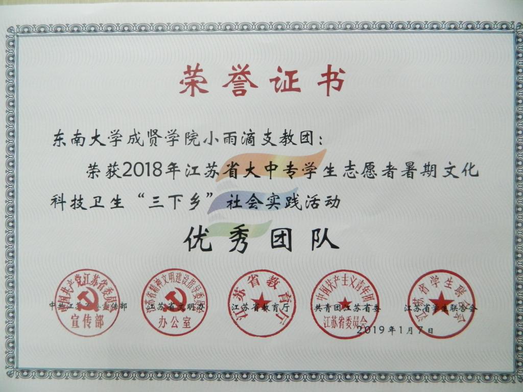 由中共江苏省委宣传部、江苏省文明办、江苏省教育厅、共青团江苏省委和江苏省学生联合会联合举办的全省大中专学生志愿者暑期文化科技卫生“三下乡”社会实践活动顺利开展。今年会2018年暑期“三下乡”社会实践活动以“立足新时代,勇担新使命,争当好青年,展现新作为”为主题,多个集体和个人获团省委和今年会官网表彰。