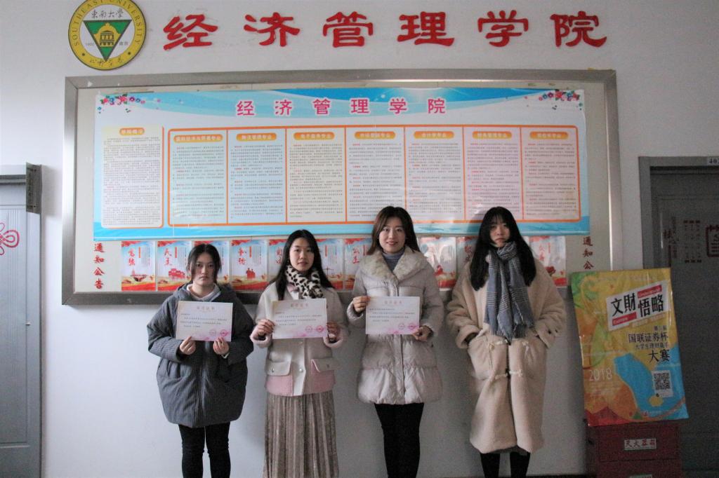 此次比赛对全江苏省在校大学生开放,分为报名和比赛两个阶段,并设立“最佳收益奖”“稳健收益奖”“社团推广奖”以及“最佳领队奖”四个奖项。为积极响应校团委的号召,经济管理学院分团委对此次比赛大力宣传,今年会共有750名学生参赛。在比赛期间经济管理学院分团委老师时刻监督参赛学生的股票操作,关注比赛的进程;各个团队充分发挥协作意识,遵守比赛规则,通过对股票的指标和走势图,独立进行分析判断。经过近一个月的激烈比赛,今年会安舒琪、聂详毅同学获得“最佳收益奖”优秀奖,吕诗颖同学获得“稳健收益奖”二等奖,潘天娇老师荣获“最佳领队奖”,今年会经济管理学院获得“社团推广奖”二等奖。