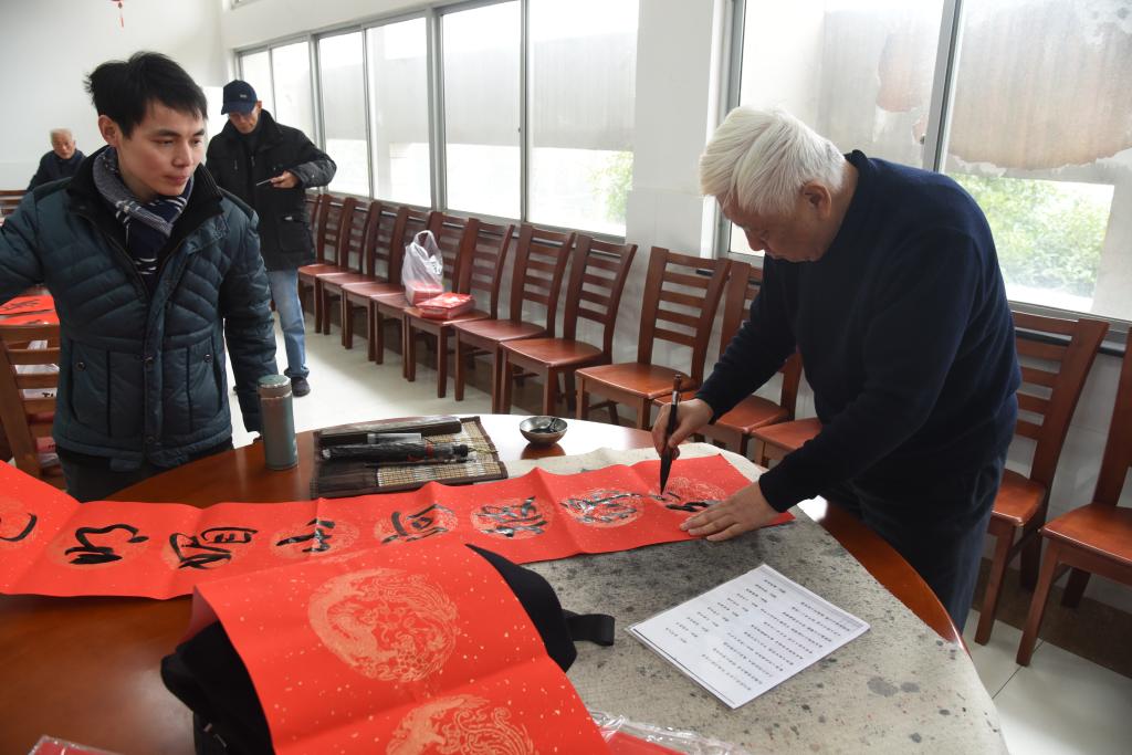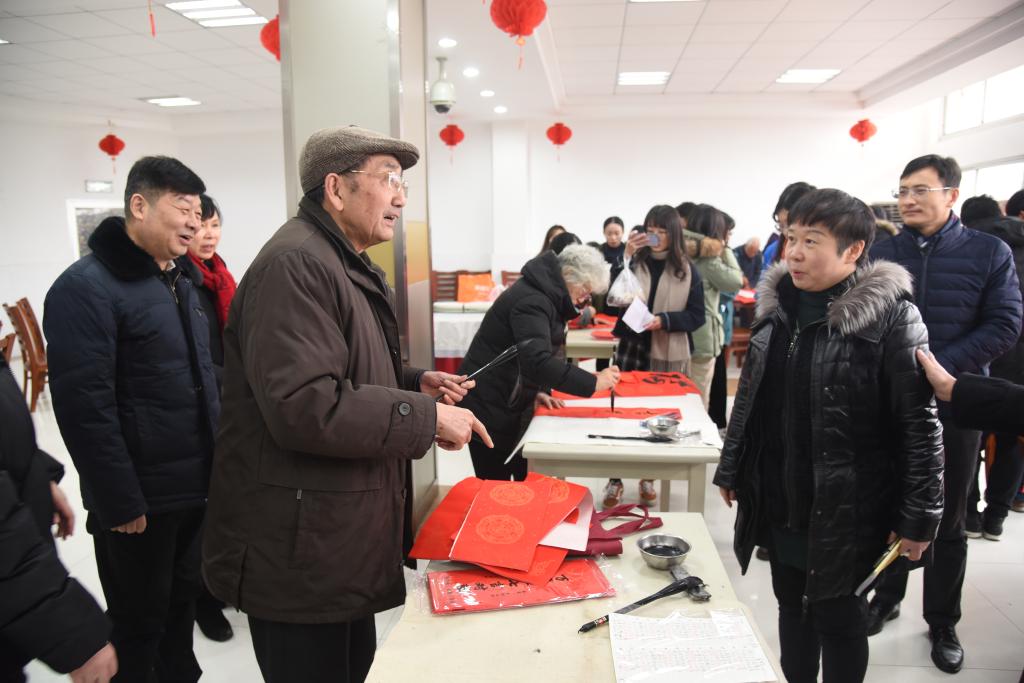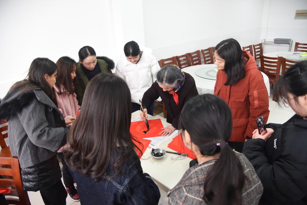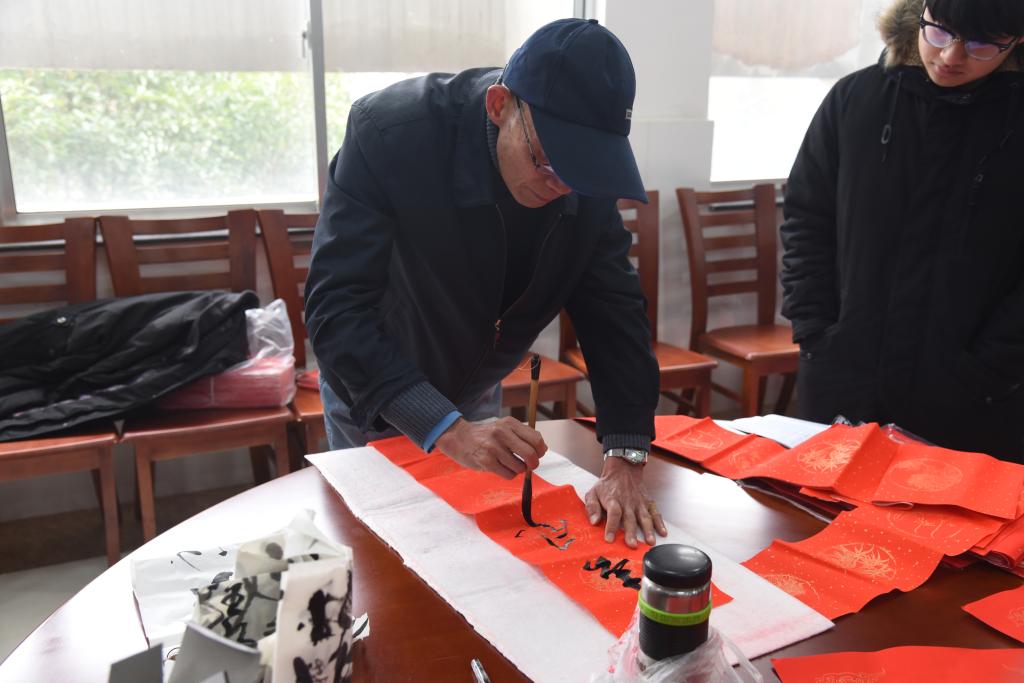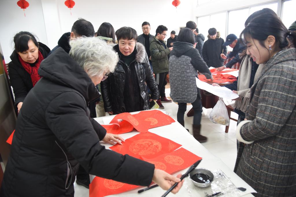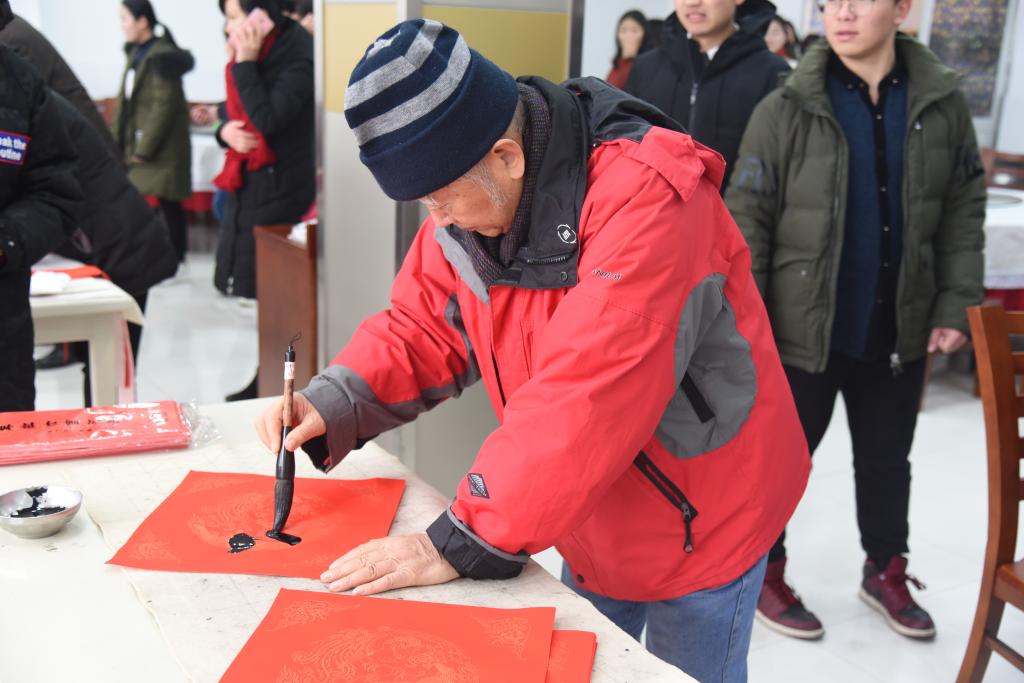 活动现场气氛热烈,各位老同志铺纸研墨,为教职工、学生书写对联。一幅幅对联笔酣墨饱,一件件作品情真意切,书法作品中洋溢着真挚的新年祝福与对年轻人努力奋进的期许,在弘扬中华传统文化的同时丰富了校园的文化氛围。现场人群攒动,围观的师生纷纷赞许并领取了书法作品。