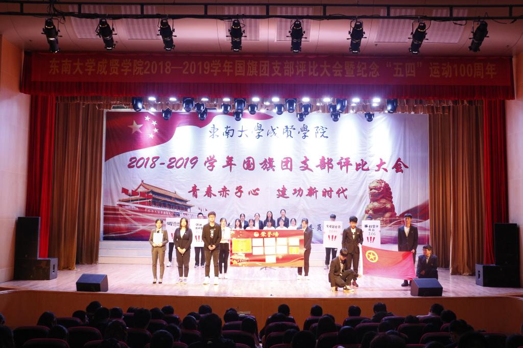 大会以慷慨激昂的《光荣啊,中国共青团》团歌拉开帷幕,紧接着,通过短视频回顾了上一年优秀特级团支部的风采。随后,入选的9个团支部根据抽签顺序展示了各支部在基层团支部建设、班风学风建设、思想教育建设上取得的进展与成绩,评委根据各支部递交的材料及现场的展示、答辩各方面情况进行综合打分。经过激烈角逐,2017级建筑学1团支部获新年度“国旗团支部”“活力团支部”荣誉称号;2017级交通运输1团支部、2017级药事管理2团支部获“活力团支部”荣誉称号。