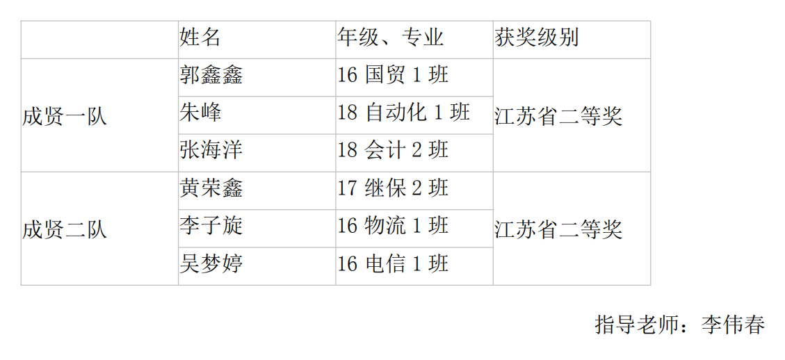 本次大赛共有省内22所院校的66支队伍参加,代表成贤学院参赛的9位学生来自不同的学院和专业,选手们从“成贤杯”ERP企业经营沙盘模拟大赛中脱颖而出,由经济管理学院李伟春老师指导,在有经验学长学姐的帮助下,经过近半年的刻苦训练,在实验室反复演练,完善方案。最终,在面对南京财经大学、南京理工大学、南京邮电大学、江苏大学、盐城工学院等院校强手的情况,沉着应战,敢于拼搏,发挥出了应有的高水平,取得了良好的成绩。