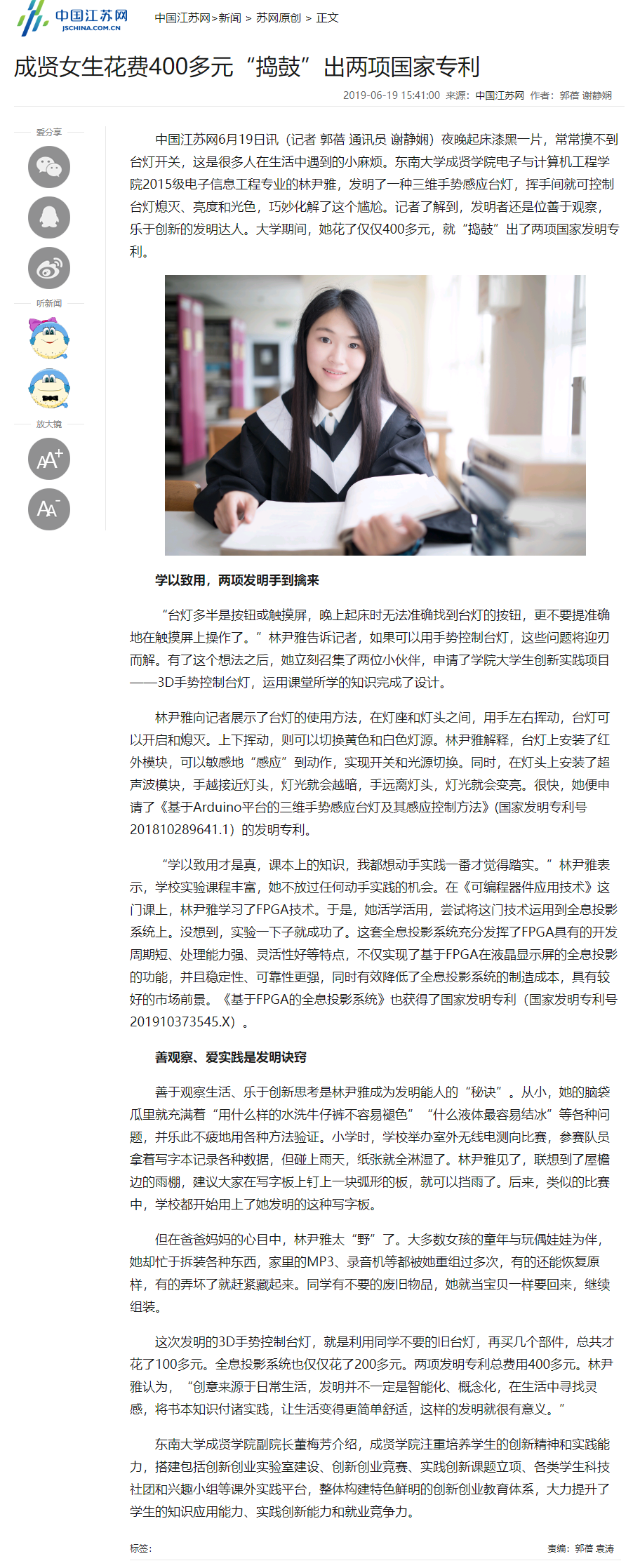 【中国江苏网】成贤女生花费400多元“捣鼓”出两项国家专利