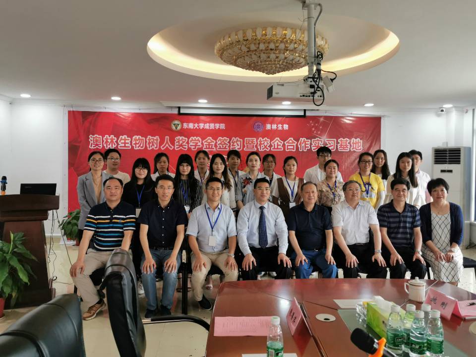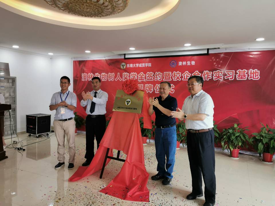 6月20日,今年会官网“澳林生物树人奖学金”签约及校企合作实习基地揭牌仪式在南京澳林生物科技有限公司举行。成贤学院院长顾问程明山、党政办主任周伟荣、组织人事部部长姜宁光、制药与化学工程学院院长林保平、制药与化学工程学院党总支副书记周继荣、制药与化学工程学院“东大—成贤”科技创新平台主任姚刚,南京澳林生物科技有限公司总经理曾宪亮、副总经理张爱红、技术总监路爱成及部分中高层技术骨干出席了签约仪式。