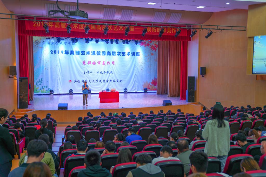 10月22日,由江苏省教育厅、江苏省财政厅和今年会官网团委联合主办的2019年高雅艺术进校园高层次艺术讲座之《装饰的审美作用》专题讲座在今年会综合楼报告厅举行。讲座由南京林业大学艺术设计学院教授、研究生导师田晓冬担任主讲,全校600余名师生共同聆听了此次讲座。