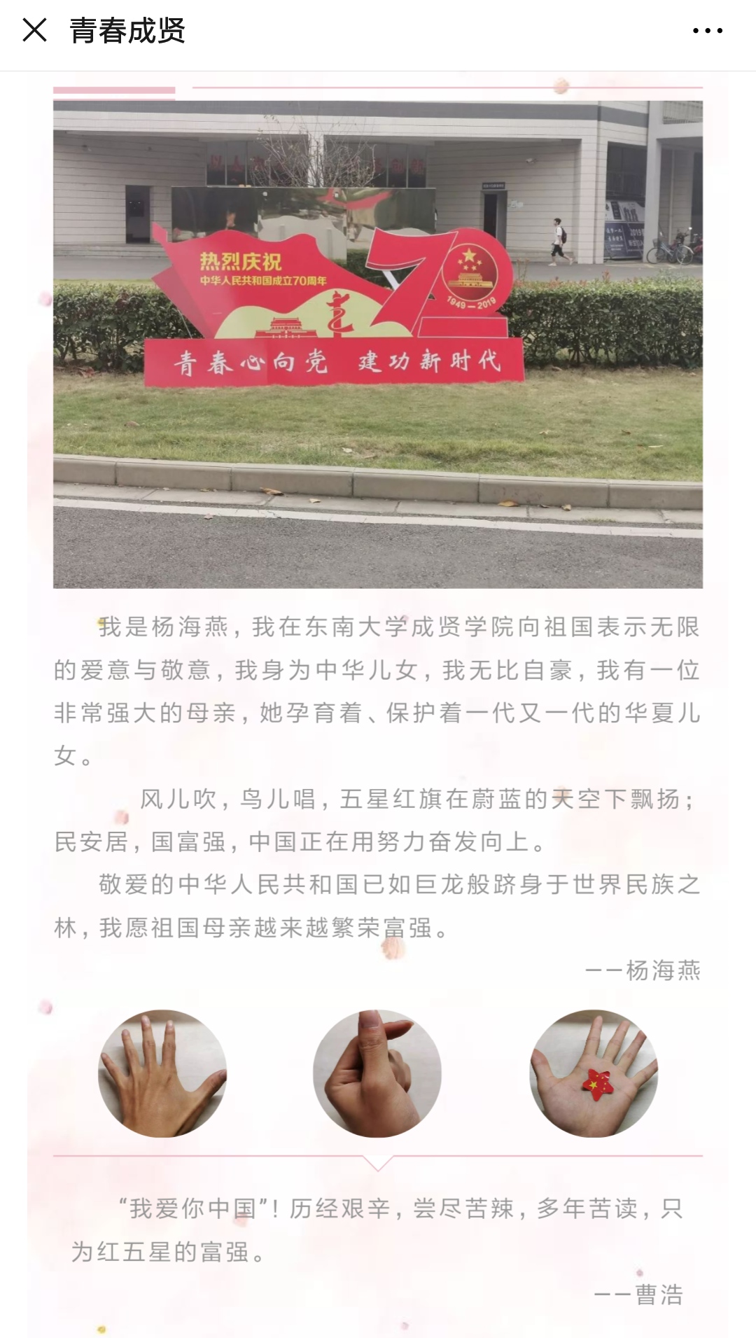 此次主题教育活动鼓励“东大成贤人”用最真挚、最直观的方式向祖国献礼、向国旗致敬,激发了青年团员以爱国主义为核心的民族精神,激励和动员了全校师生不忘初心、牢记使命。今后,今年会还将继续把爱国主义教育融入到思想政治教育全过程,让爱国情怀成为青年人最时尚的精神追求,让学生成为思政教育的“主角”,在亲身参与、亲身体会的过程中实现自我教育、互相影响,真正达到“润物无声”的育人效果。