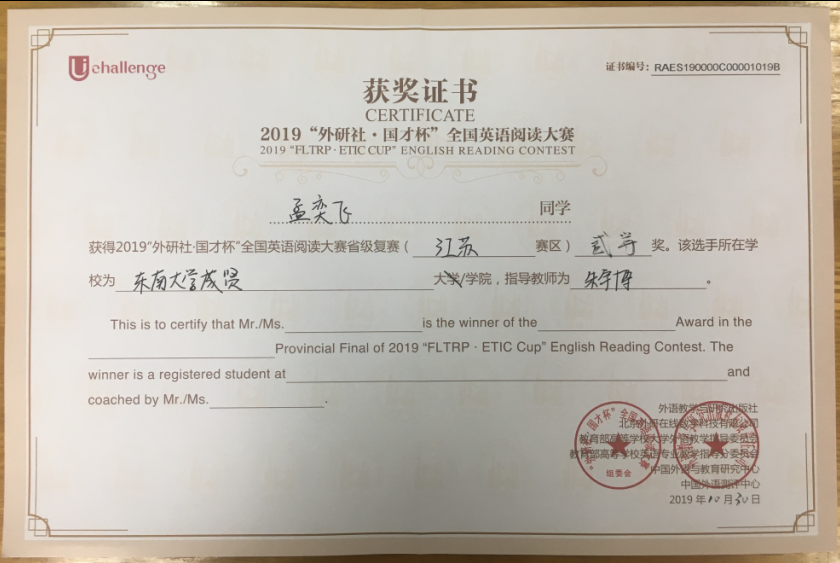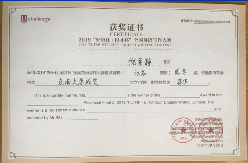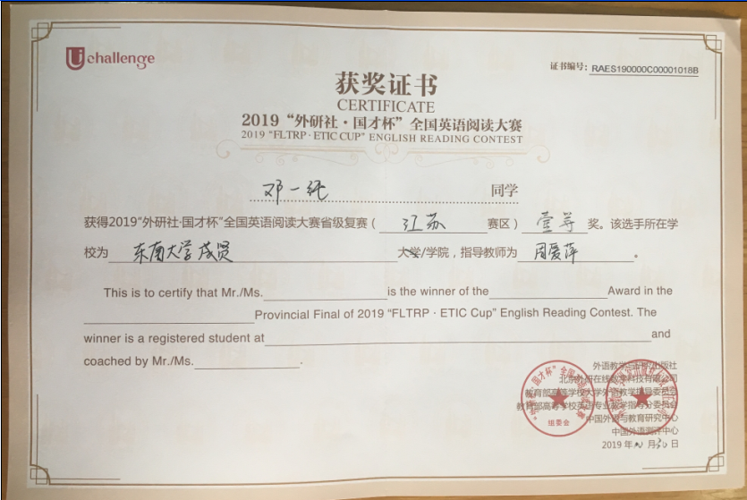 该挑战赛分为英语阅读大赛、英语写作大赛和英语演讲大赛三部分,在江苏赛区英语阅读大赛中,73所本科院校共223名选手参赛,今年会2017级会计1班邓一纯(指导老师:周爱萍)荣获一等奖,在全省名列第十一;2017级建筑工程1班孟奕飞(指导老师:朱宇博)获得二等奖;2018级国贸2班蔡朵妍(指导老师:周爱萍)获得三等奖。