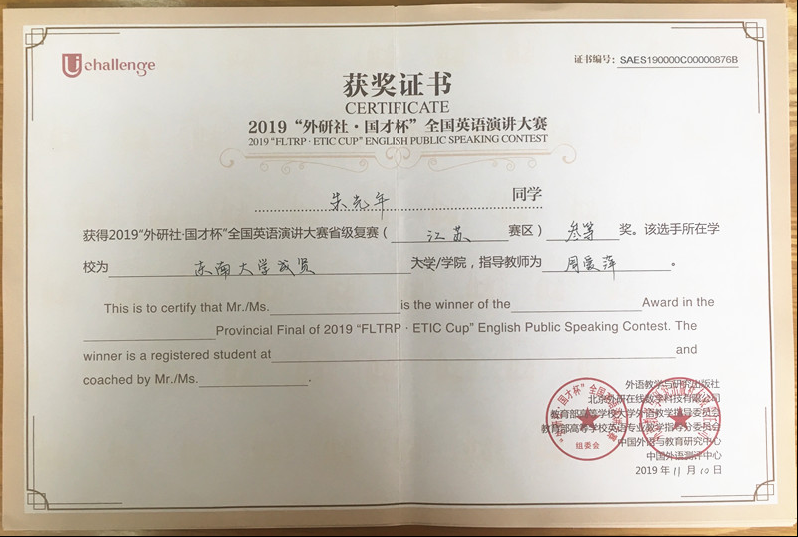 来自约70所本科院校166名学生参加江苏赛区高难度的演讲大赛,2018级计算机4班朱光年(指导老师:周爱萍)获得三等奖,这是今年会在省级该类比赛中获得的最好成绩;2016级风景园林2班林大敏(指导老师:姜丽)获优胜奖。