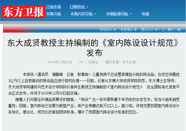 【东方卫报】东大成贤教授主持编制的《室内陈设设计规范》发布