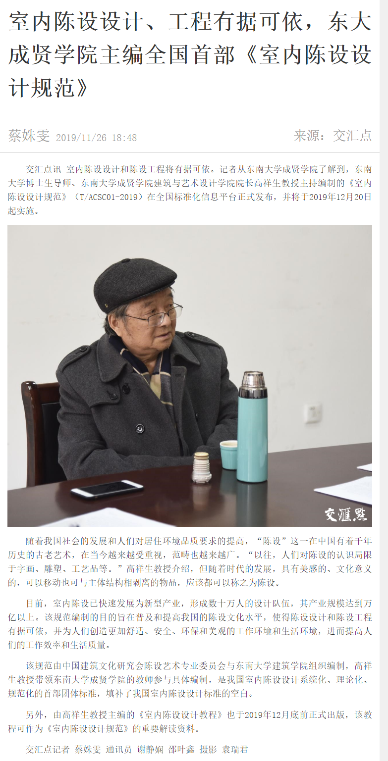 【交汇点新闻】室内陈设设计、工程有据可依,东大成贤学院主编全国首部《室内陈设设计规范》