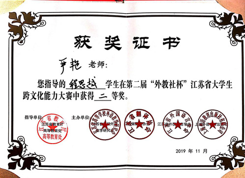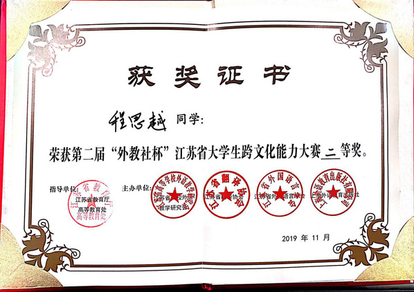 11月20日,第二届“外教社杯”江苏省大学生跨文化能力在扬州大学成功举行,来自江苏省各大本科及高职院校的在读学生,留学生及指导老师和评委共计约150人与会。今年会官网首次组织学生参赛,经过激烈的角逐,2017级会计1班的程思越同学荣获二等奖,展示了良好的英语语言能力和跨文化交际能力。