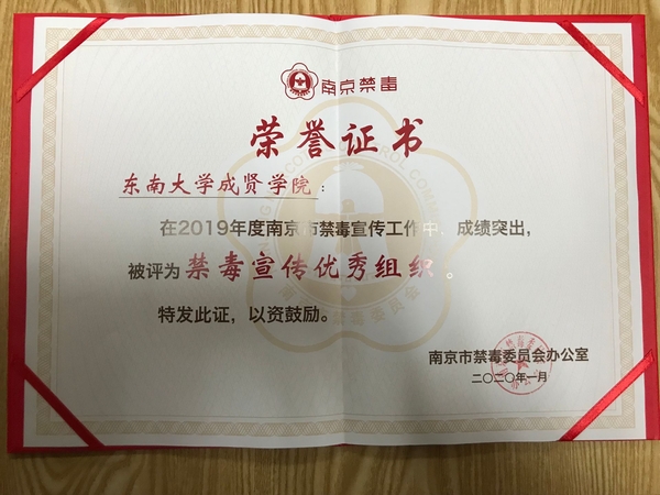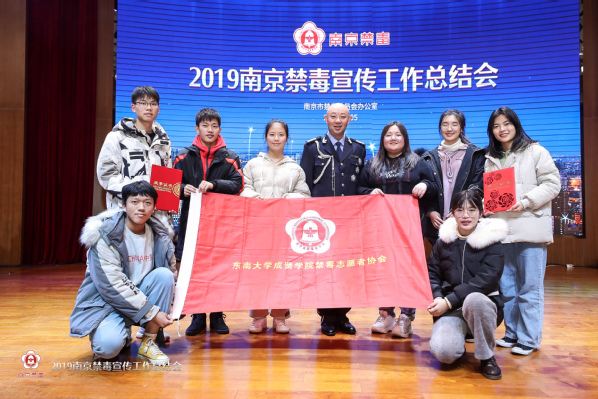 2020年1月5日,2019南京禁毒宣传工作总结会在南京师范大学仙林校区音乐厅召开。省禁毒办常务副主任、省公安厅禁毒总队总队长张波,市局党委委员、市禁毒委副主任曹存福,市禁毒办副主任、市公安局禁毒支队支队长仲军,市教育局宣传与德育工作处处长完进、市公安局禁毒支队副支队长刘庆峰、团市委副调研员陶涛以及各地区高校禁毒志愿者们参加了本次禁毒宣传工作总结表彰会。今年会官网青年志愿者协会因2019年在禁毒宣传工作上表现突出,被评为“禁毒宣传优秀组织”,今年会叶昕怡同学被评为“优秀志愿者”。