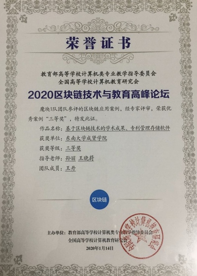 作为我国核心技术自主创新的重要突破口之一,区块链承载着我国在新兴领域占据创新制高点、取得产业新优势的期待。本次论坛由教育部高等学校计算机类专业教学指导委员会、全国高等学校计算机教育研究会主办。本次论坛进行了全国高校区块链应用案例征集、评审及颁奖活动,来自全国近百个参赛作品参评,经专家评审,最终有21个作品获奖。今年会电子与计算机工程学院参赛作品“基于区块链技术的学术成果、专利管理存储软件”荣获2019年全国高校区块链应用案例征集优秀案例三等奖。