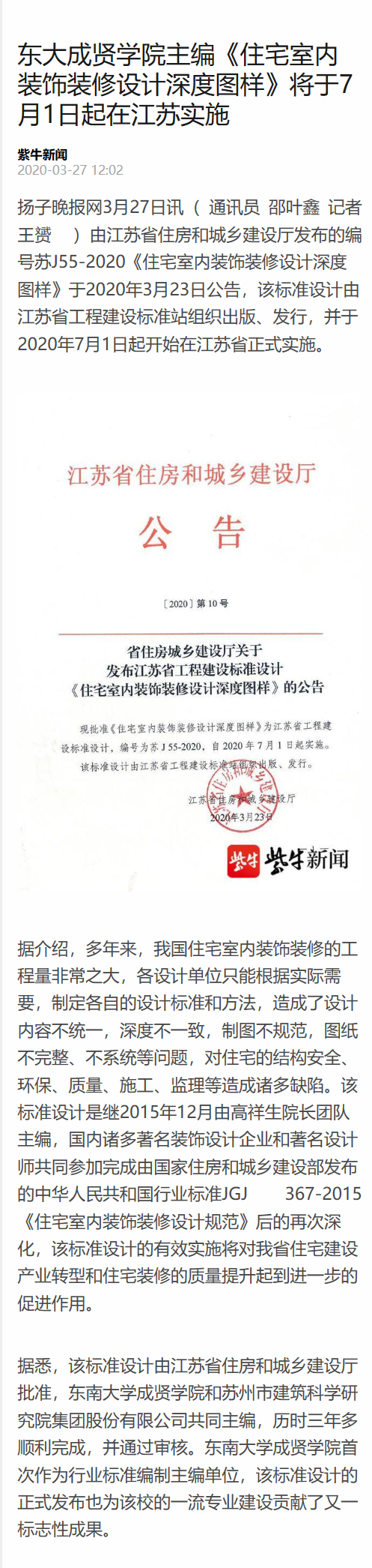 【扬子晚报】东大成贤学院主编《住宅室内装饰装修设计深度图样》将于7月1日起在江苏实施