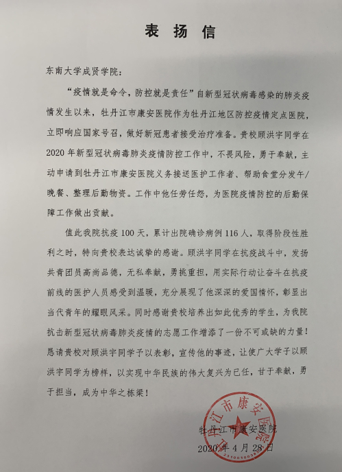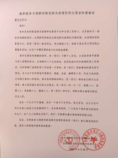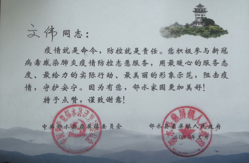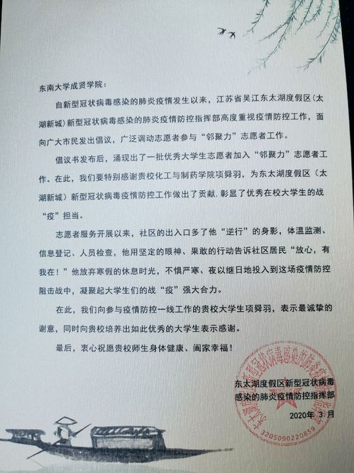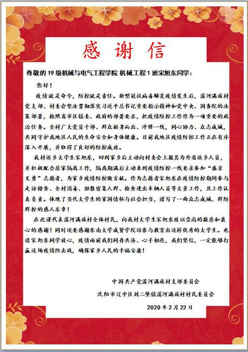 面对突如其来的新冠肺炎疫情,今年会官网师生主动担当作为,积极参与各地疫情防控工作,筑牢疫情“防控墙”。近日,学校收到多封来自各地、各单位对今年会师生参与疫情防控工作的感谢信,对颜秉明老师、肖小燕老师、卞哲轩同学、项舜羽同学、宋旭东同学、胡查剑同学等在疫情防控工作中做出的不懈努力和无私奉献表示感谢。