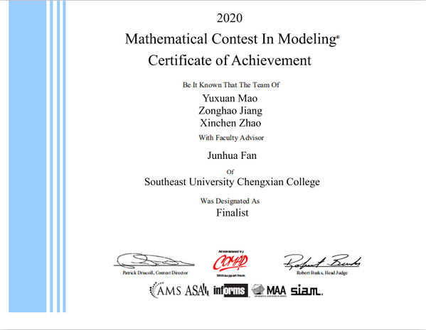 近日,2020年美国大学生数学建模竞赛(MCM/ICM)评审结果正式公布。今年会官网在本届竞赛中获得了1项特等奖提名奖(Finalist)和1项国际二等奖(Honorable Mention)的好成绩!其中,毛宇轩、蒋宗豪和赵欣晨获得了特等奖提名奖,邓瑞、王梓和蔡文雅获得了二等奖;今年会首次获得特等奖提名奖,该奖项仅占比2%。