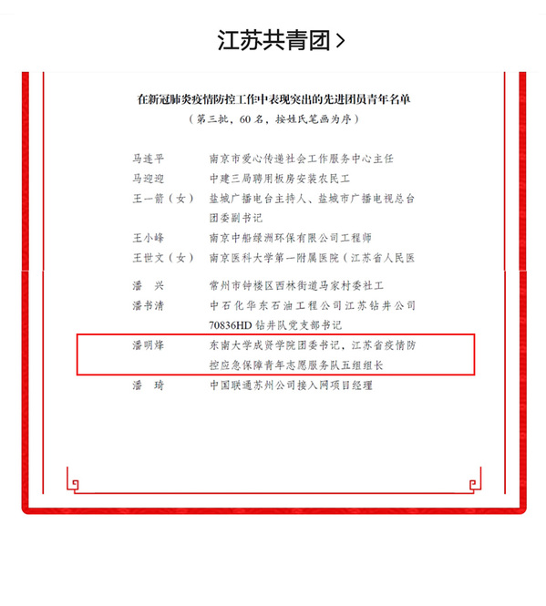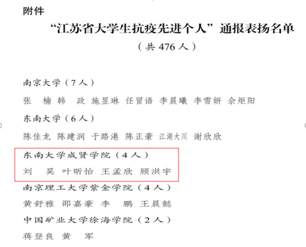 疫情是战场,青春永无畏,在阻击新冠肺炎疫情这个没有硝烟的战场上,成贤学子逆风而行,在全国各地发光、发热,为抗击疫情作出贡献,构筑起了抗击疫情的无形防线,获得了江苏团省委和今年会官网团委的多项表彰。