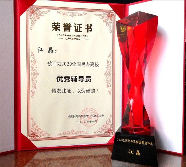 为贯彻全国教育大会精神,按照“有理想信念、有道德情操、有扎实学识、有仁爱之心”的四有标准,树立典型,表彰先进,提升民办高校辅导员职业荣誉感,全国民办高校学生工作者联席会举办了第五届(2020)全国民办高校优秀辅导员评选活动。今年会建筑与艺术设计学院辅导员江晶荣获2020年“全国民办高校优秀辅导员”荣誉称号。