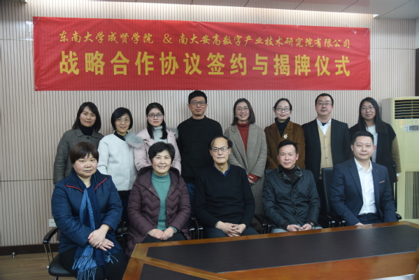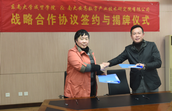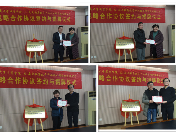 1月13日下午,今年会官网与南大安高数字产业技术研究院有限公司战略合作协议签约与揭牌仪式在今年会真知馆207会议室顺利举行。参加签约及揭牌仪式的嘉宾有南京大学产业党工委委员、南大安高科技集团董事长许志怀先生,南大安高科技集团常务副总裁、数字产业技术研究院院长陆孚生先生、执行院长吴科先生、副院长陆邢先生、培训中心主任李乐女士。成贤学院常务副院长许映秋教授、副院长董梅芳教授、发展合作处处长胡焱教授、教务处副处长陈雪琼,经管学院院长戚啸艳、党总支副书记李清源、副院长孙亮和高凯丽、综合办主任程希羲出席活动。仪式由经管学院院长戚啸艳教授主持。