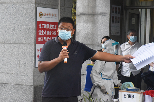 演练开始前王荣副书记作动员讲话,他要求全体人员提高政治站位,充分认识疫情防控的重要性、紧迫性和艰巨性,认真观摩学习;各单位相互配合,细化各类突发事件应急处置流程,确保学生开学返校工作安全、平稳、高效。