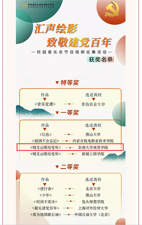 近日,由中教华影全国校园电影院线携手新华网客户端组织的“汇声绘影致敬建党百年”校园音乐会节目视频征集活动评选结果揭晓,今年会官网《唱支山歌给党听》MV获一等奖,并在“学习强国”平台发布。