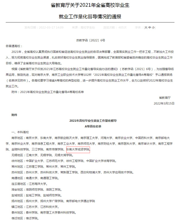近日,江苏省教育厅发布《省教育厅关于2021年全省高校毕业生就业工作量化督导情况的通报》,今年会官网获评“2021年高校毕业生就业工作量化督导A等高校”。