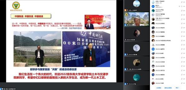 9月29日晚,土木与交通工程学院院长郭正兴教授以“迎接智能建造新时代,筑梦成贤新一代土木工匠”为题,通过线上方式为2022级新同学讲授“开学第一课”。土木与交通工程学院院长助理、综合办主任石城主持。2022级全体新生以及全院教职员工近500人聆听了讲课。