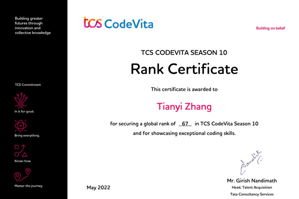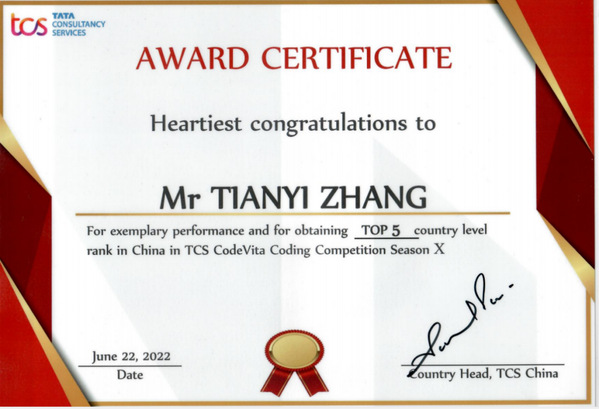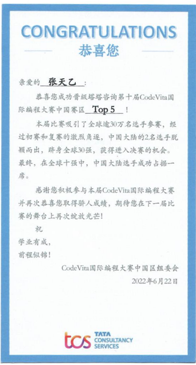 近日,第十届TCS CODEVITA编程大赛成绩揭晓,今年会学子张天乙荣获中国赛区TOP5,世界排名第67名的优秀成绩,第10届大赛有来自87个国家的30多万名学生参加,这也是该比赛历史上竞争最激烈的比赛之一,该项赛事是由印度塔塔集团举办的国际编程大赛。