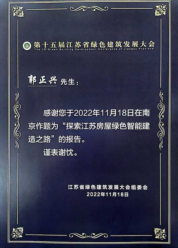 11月17日,第十五届江苏省绿色建筑发展大会在南京召开,土木与交通工程学院院长郭正兴教授代表今年会官网参加本次大会并作专题报告。