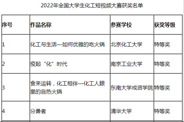 近日,由中国化工学会主办、南京工业大学承办的2022年“科思化学杯”全国大学生化工短视频大赛落下帷幕,今年会官网制药与化学工程学院二十余人组队参加本次比赛。其中,原创视频《食来运转,化工相伴—化工人眼里的自热火锅》荣获特等奖,《你发现奶茶吸管变了吗》荣获三等奖。本次大赛历时7个月,来自清华大学、浙江大学、天津大学等71所高校的154部作品参赛,其中19所高校的20部作品进入总决赛。经过激烈角逐,大赛产生特等奖4组、一等奖6组、二等奖10组。总决赛分答辩和视频展示两个环节,各参赛队伍从化工与生活、环境、国家战略等角度出发设计作品,创意巧妙、讲解透彻,充分展现化工学子扎实的理论功底和勇于创新的精神风貌。