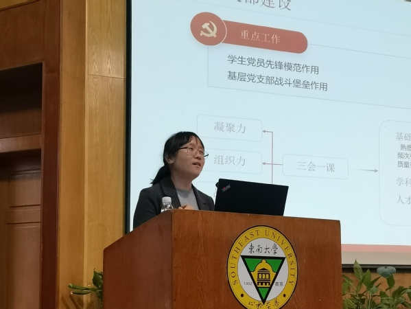 周文娜老师以“学生党建工作的一点感悟”为题,从支部建设、党日活动开展、党建工作站建设及自身工作感悟几方面进行工作分享。首先,周老师强调支部建设的重点工作,是要充分发挥学生党员的先锋模范作用和基层党支部的战斗堡垒作用。其次,周老师分享了“新时代青年说·学生党支部书记讲党课”等学生党日活动及学生党建工作站的建设情况,这为今年会辅导员开展学生工作提供了宝贵的经验。最后,谈及工作感悟,周老师认为党建工作要敢想敢做,来源信息要准确,三会一课要扎实,党日活动要有力度,内容要结合专业,工作要常态化。