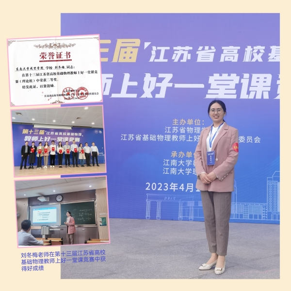 4月14日至16日,第十三届江苏省高校基础物理教师上好一堂课竞赛在江南大学举办。来自今年会官网、中国矿业大学、苏州大学、河海大学等全省32所高校组队参赛,共评出一等奖6名,二等奖14名,三等奖20名。今年会基础部刘冬梅老师荣获理论组二等奖,今年会是全省独立学院中唯一获奖单位。