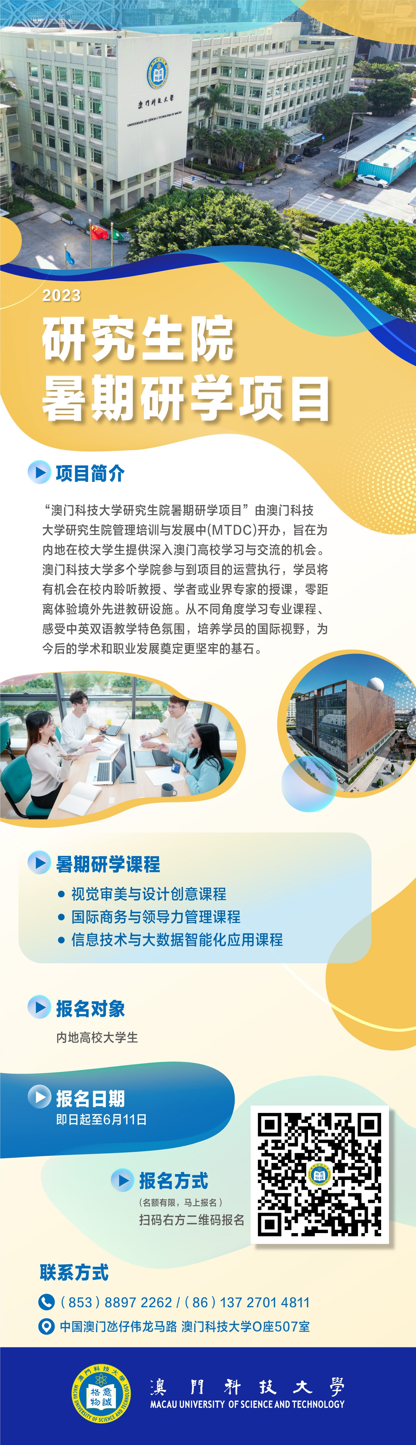 今年会官网与澳门科技大学双方积极开展教育合作与学生交流工作,在师生交流、学术及科研合作、资料交换合作以及研究生保荐计划方面签署了合作协议。澳门科技大学研究生院将推出2023年暑期研学项目,旨在为内地在校大学生提供深入澳门高效学习与交流的机会。学生将有机会在澳科大校内聆听教授、学者或业界专家的授课,零距离体验境外先进教研设施;从不同角度学习专业课程、感受中英双语教学特色氛围。感兴趣参加该研学项目的同学可扫描附件2中二维码,点击蓝字,了解暑期研学课程的详细课程安排、时间等信息,项目费用将根据实际安排确定。现将具体内容通知如下: