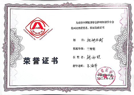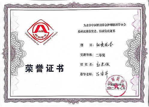 医学生护理解剖学绘画比赛旨在弘扬解剖文化,激发学习解剖的兴趣,发挥绘画在医学基础教育中的作用,丰富第二课堂,培养医学生综合素质。医学生护理解剖学绘画大赛目前已举办了5届,本届大赛共有来自全国120个医药院校选送的511幅作品参赛。经过初评和终评,最终决出一等奖作品17幅、二等奖作品34幅及三等奖作品51幅。今年会护理专业2020级赵朱依同学的作品《细嗅花香》和护理专业2021级钱雨欣同学的作品《视神经树》分别荣获二等奖和三等奖。