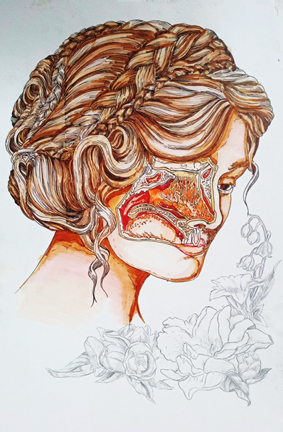 作品创意: 缤纷的人物和单调的黑白花卉形成对比,完整的脸部对比着解剖视图,希望能将注意力聚焦于人体内部的精巧结构,让我们对自身的身体结构有更深入的认识。鼻腔是嗅觉神经的所在之处,是人类最古老、最原始的感官之一。它把气味的感觉信息传递给大脑,对我们的感情和内分泌产生影响。如果我们失去了嗅觉,即便花香四溢,我们也无法领略它们的美妙。所以,我们唯有护理好自己的身体,才能更好地享受美好的生活。