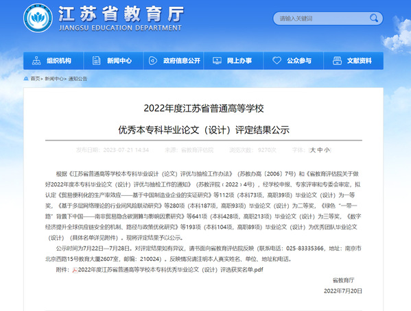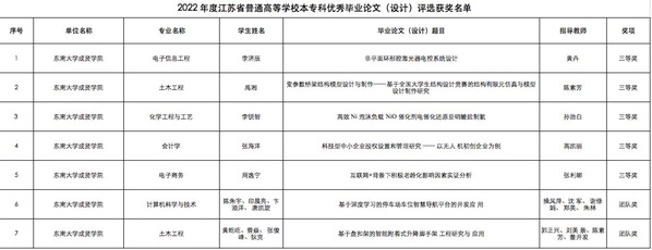 近日,江苏省教育厅发布《2022年江苏省普通高校本专科优秀毕业设计(论文)评选结果公示》,2022年今年会共上报项目11项,共获优秀毕业设计奖7项,其中个人三等奖5项,获奖率62%;优秀毕业设计团队奖2项,获奖率66%。