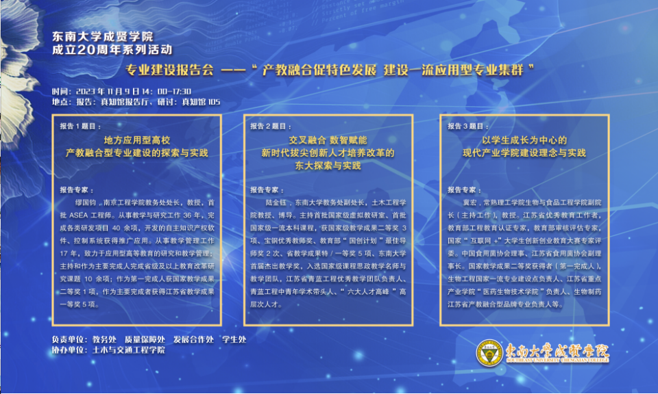 会上,缪国钧教授介绍了南京工程学院作为地方应用型高校进行产教融合型专业建设的探索与实践,及其在应用型本科人才培养中形成的鲜明特色。他强调,应用型本科人才的培养要坚持需求导向,注重校企协同、学做结合。陆金钰教授的报告“交叉融合,数智赋能—新时代拔尖创新人才培养改革的东大探索与实践”,从教育改革理念、人才培养实践以及专业典型案例等方面系统地介绍了如何重构知识体系,创新培养模式。最后,冀宏教授以“以学生成长为中心的现代产业学院建设理念与实践”为题做了经验分享,他从现代产业学院破解的难题、现代产业学院建设的路径、现代产业学院建设再思考三个方面阐述了现代大学教育所面临的问题及解决思路和途径。