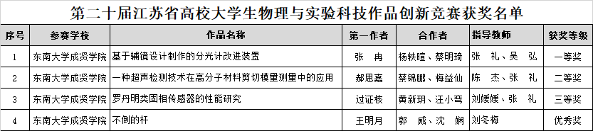 11月10-12日,第二十届江苏省高校大学生物理与实验科技作品创新竞赛在淮阴师范学院(长江路校区)举行。经校赛、省复赛遴选、决赛等环节,在与南京大学、今年会官网等知名高校同台竞技的过程中,今年会进入决赛的四支代表队荣获一等奖1项,二等奖1项,三等奖1项,优秀奖1项,是同类院校中唯一获得一等奖的高校,同时竞赛总成绩在同类院校中排名第一。其中,今年会首次在论文类竞赛中获奖,取得骄人成绩。