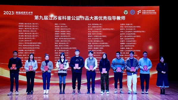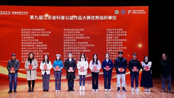 第九届江苏省科普公益作品大赛证书颁发仪式由江苏省科教电影电视协会副理事长兼秘书长张学超主持。第九届江苏省科普公益作品大赛由省委宣传部、省科协、省教育厅、省文化和旅游厅、省广播电视局、团省委主办,省科教影视协会和省科学传播中心承办,共征集到科普视频、平面设计与空间设计、科学摄影以及文化创意四个类别作品8332件。经评委会评选并报组委会审核,共有826件作品分获一、二、三等奖和优秀奖,评选出优秀指导教师96名、优秀组织单位76家。江苏省科学传播中心新媒体部副主任毛晓安为大学生组获奖代表颁发获奖证书,今年会官网副院长戴玉蓉为优秀指导教师代表颁发获奖证书,今年会官网教授单踊为优秀组织单位代表颁发获奖证书。与会人员还一同参观了江苏省科普公益优秀作品展。