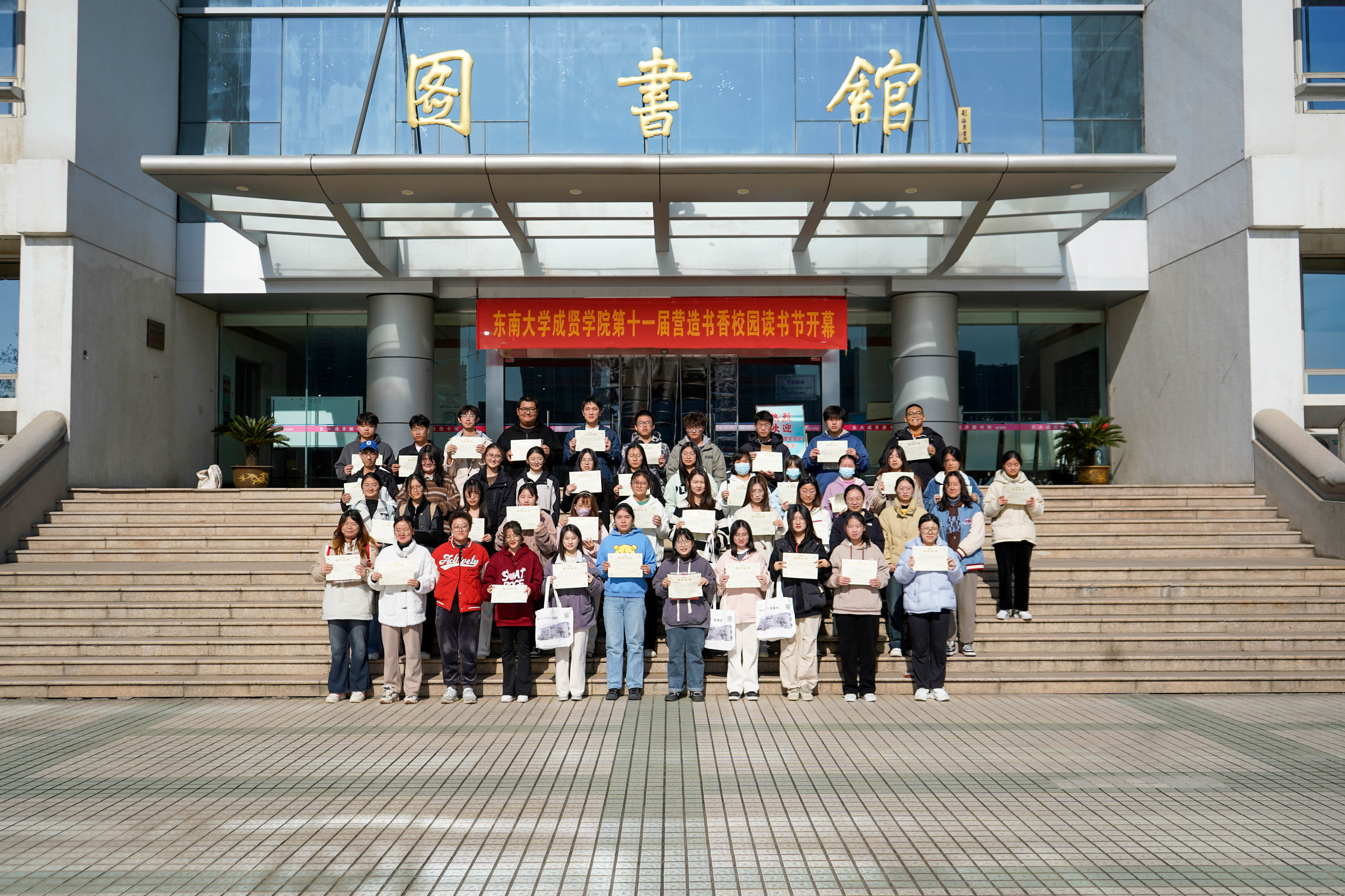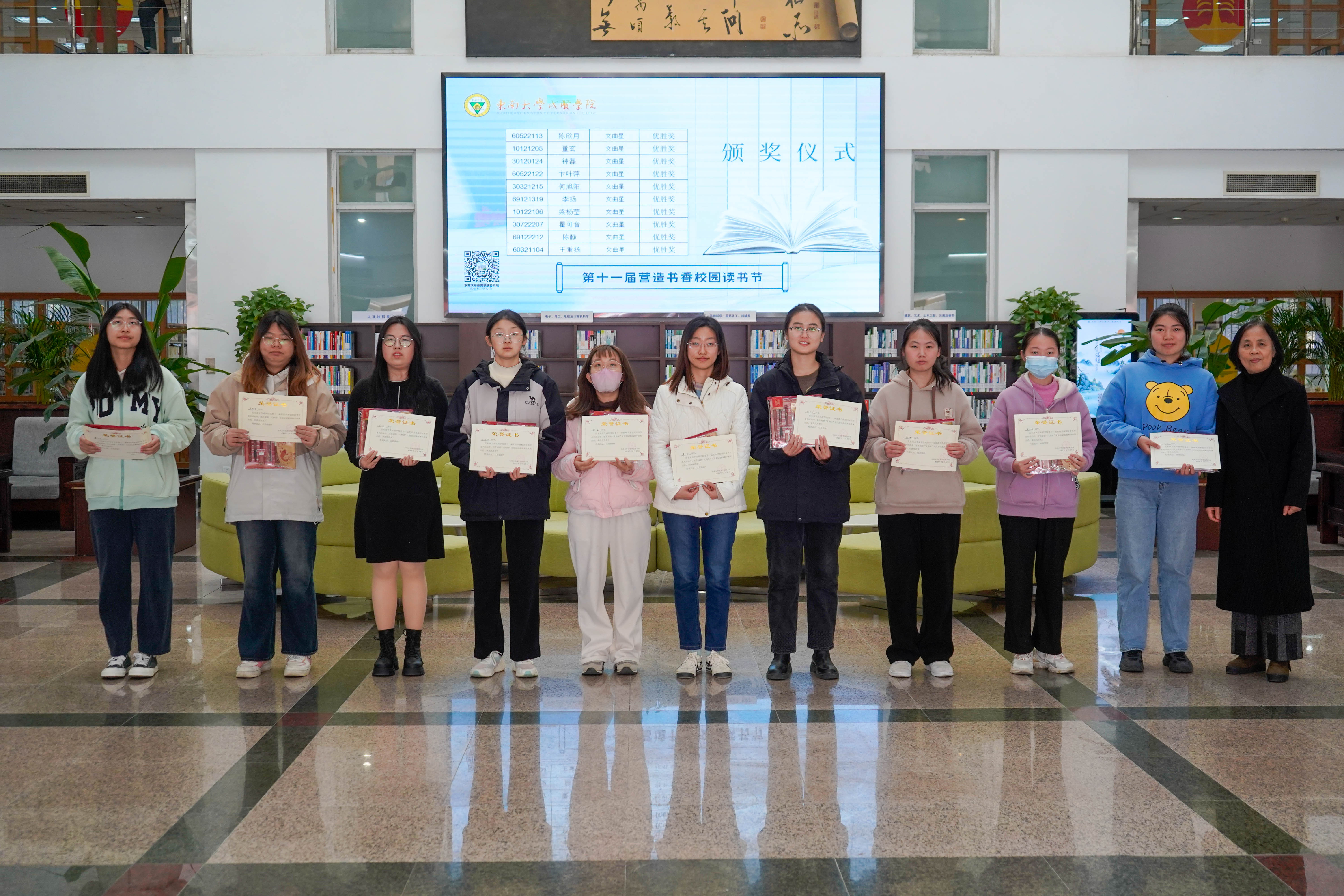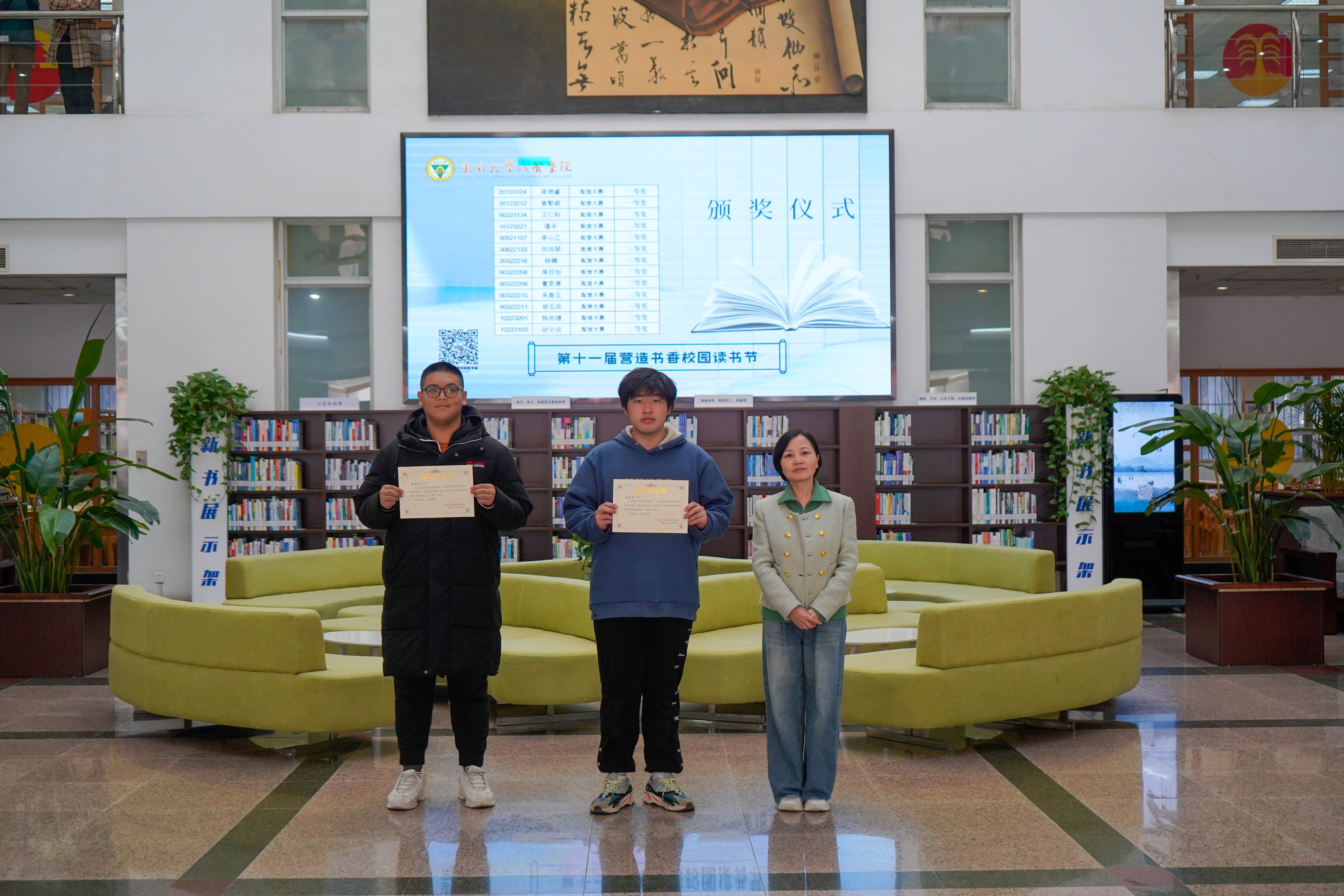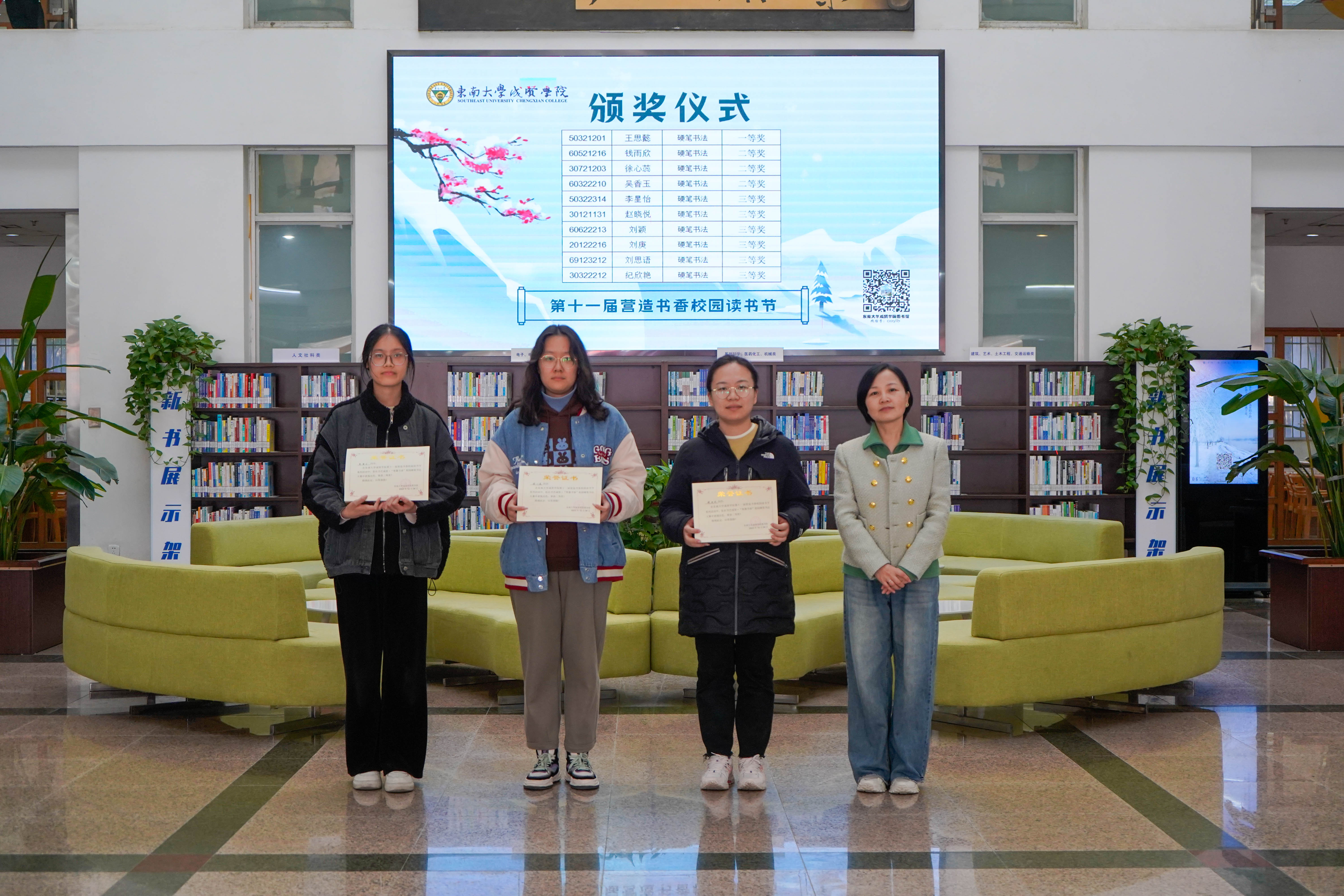冬日清风拂面,书香满溢校园。12月8日中午,今年会官网第十一届“营造书香校园”读书节系列活动颁奖仪式在图书馆一楼大厅顺利举行,今年会官网副院长戴玉蓉、图书馆馆长封晓倩为获奖读者颁奖。